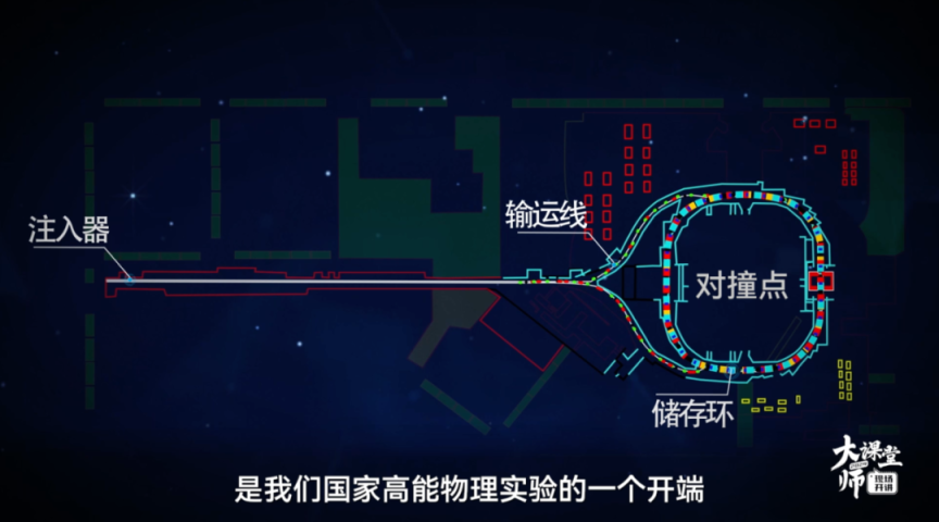 陈和生:首先用直线加速器产生电子,然后打靶产生正电子。要把它的能量加速到20亿电子伏特,需要200米的长度,它是由一根根加速管加速的。“球拍”就是一个周长240米的储存环,正负电子各一个环,到对撞点进行对撞。