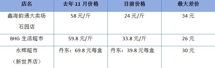 记者先后走访了BHG生活超市、永辉超市等多家商超发现,丹东、佳沃、红颜等品种的草莓散发着阵阵清香,有的按盒出售、有的按斤售卖,价格与去年11月调查时相比都出现了不同程度的下跌。其中鑫海韵通大卖场石园店的草莓价格由此前58元/斤降至24元/斤,BHG生活超市的草莓价格由此前59.8元/斤降至33.8元/斤,永辉超市(新世界店)同款草莓价格由此前69.8元/盒降至39.8元/盒。随后,记者通过美团APP查询发现,此前价格在40-80元/斤的草莓,线上售价也跌至了30元左右/斤。