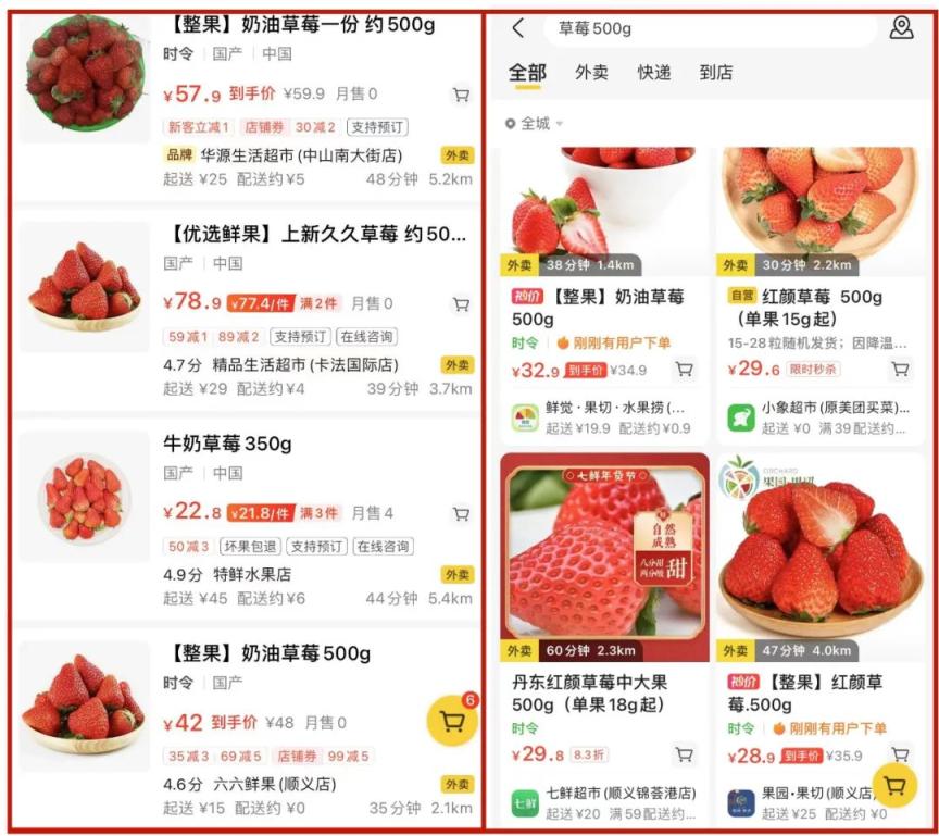 此前价格在40-80元左右/斤的草莓(左),售价也跌至30元左右/斤(右)。图片来源:北青社区报