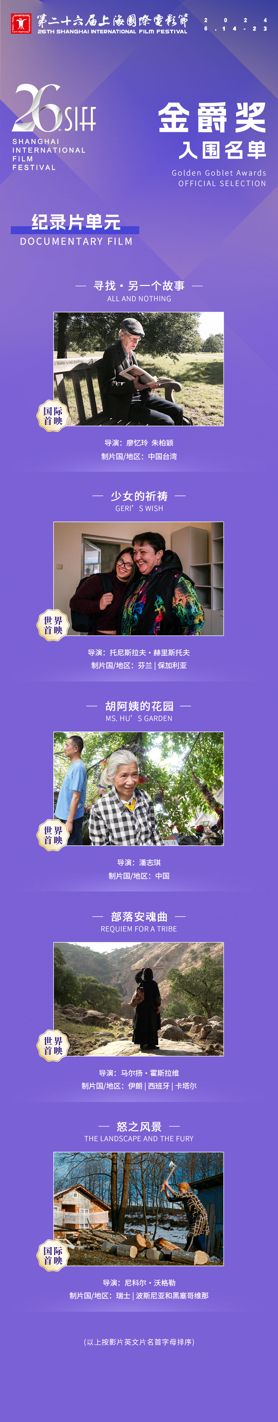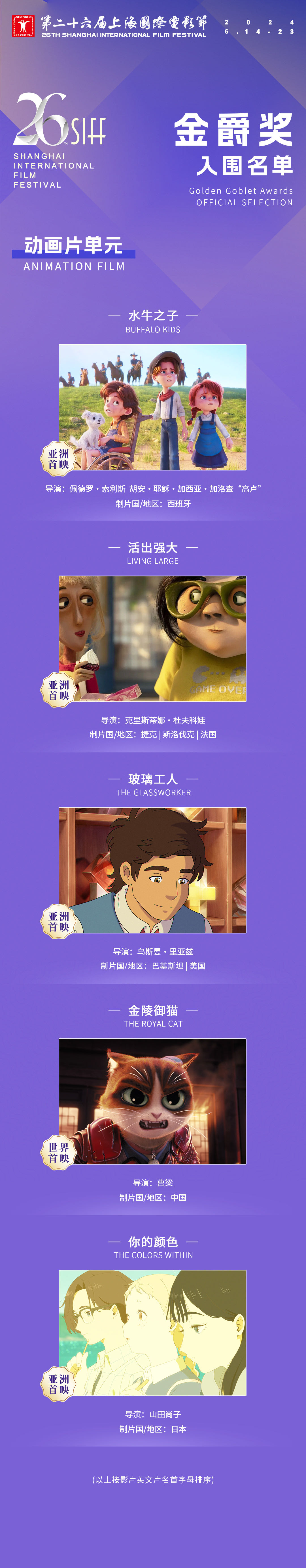 5月29日,第二十六届上海国际电影节组委会公布了本届金爵奖各单元入围名单。报名参赛的作品中,最终50部作品入围金爵奖主竞赛、亚洲新人、纪录片、动画片、短片五个单元,世界首映38部,国际首映6部,亚洲首映6部,世界首映率又创新高;主竞赛单元的14部入围影片中,12部世界首映、2部国际首映;入围亚洲新人单元的11部作品均为世界首映。