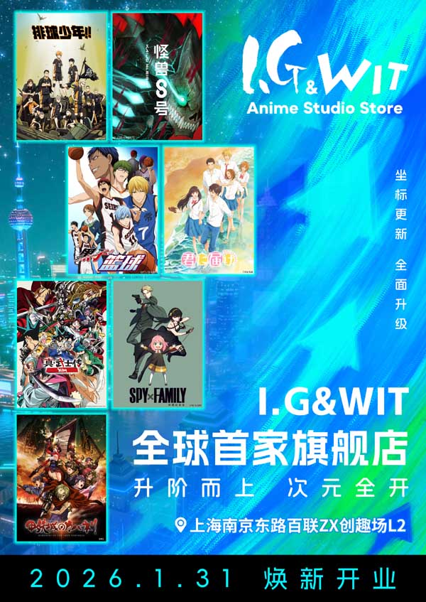 国际知名动画制作公司Production I.G & WIT STUDIO(总部:东京武藏野)官宣,1月31日其全球首家旗舰店将全面焕新升级!为提供更优质的购物与互动体验,店铺将从上海南京东路百联ZX创趣场一层搬迁至二层,并于焕新后以更大空间、更多IP、更全商品、更沉浸互动体验和更丰富的活动迎接广大粉丝,升阶而上,全面升级。